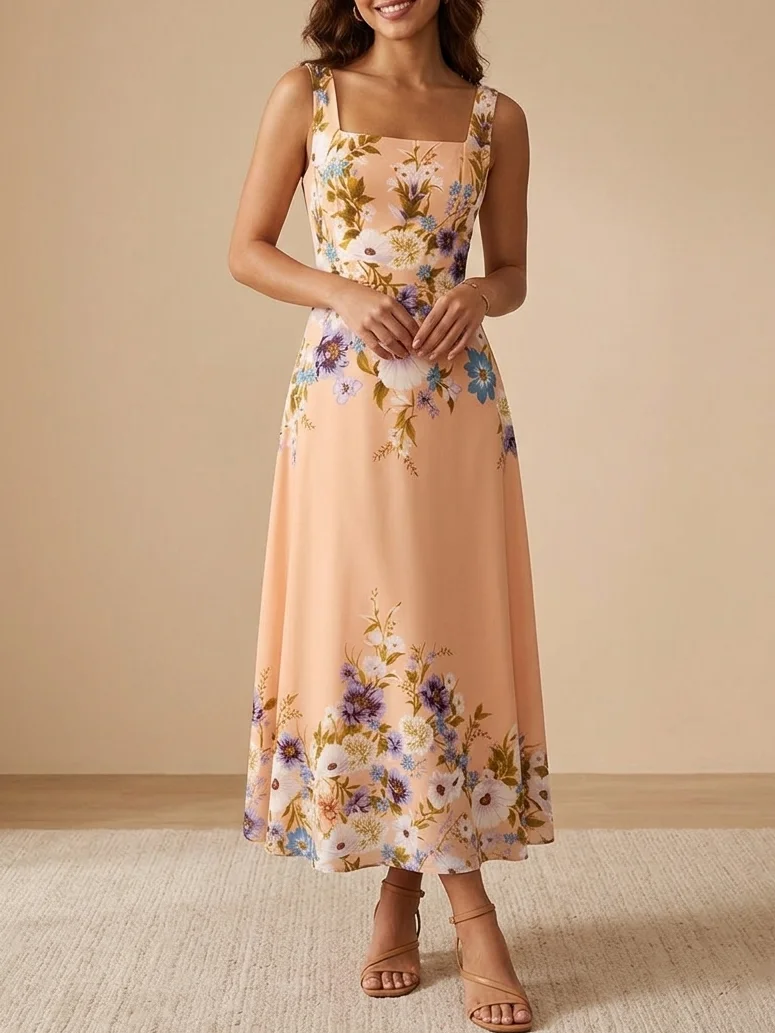 This peach floral chiffon bridesmaid dress features a flattering square neckline and a flowing A-line maxi silhouette. The soft floral print adds a romantic touch, making it perfect for spring weddings, garden ceremonies, and elegant bridal parties.