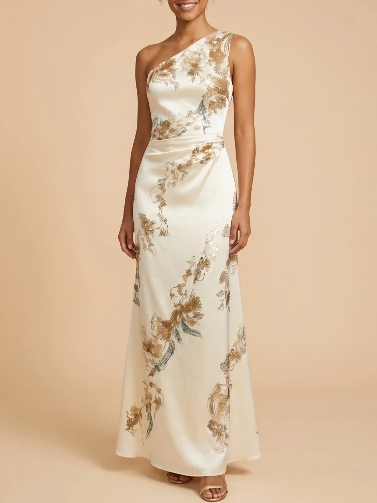 This beige floral bridesmaid dress features a one shoulder neckline and a sleek sheath maxi silhouette. The soft floral design adds elegance, making it perfect for weddings, formal events, and refined bridal parties.