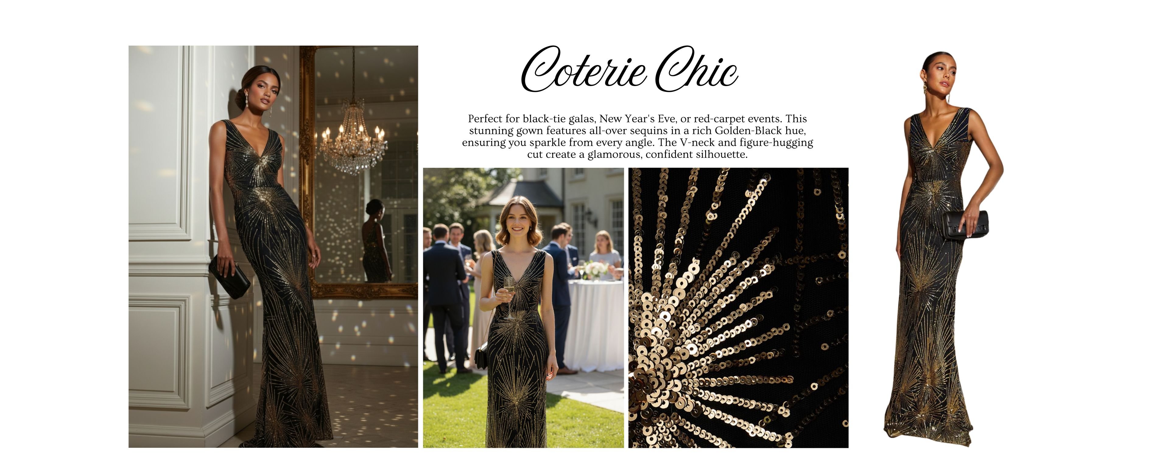 Perfect for black-tie galas, New Year's Eve, or red-carpet events. This stunning gown features all-over sequins in a rich Golden-Black hue, ensuring you sparkle from every angle. The V-neck and figure-hugging cut create a glamorous, confident silhouette.