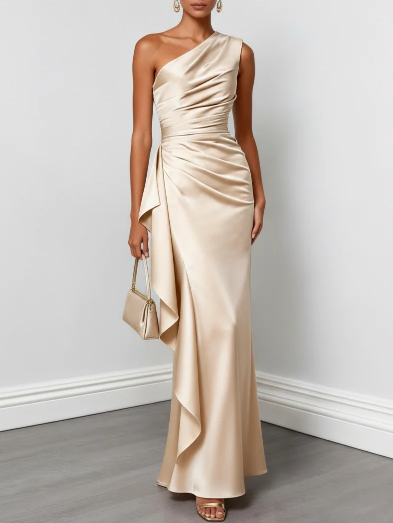 Glow at high-end galas, black-tie weddings, or milestone celebrations. This one-shoulder dress features a beautifully ruched bodice and a sweeping floor-length skirt. Crafted in tiered champagne ruffled tulle, the design offers a voluminous movement.