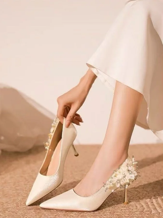 Elegant Bridal Glamour Satin Diamond Pearl Floral Pointed-toe Wedding Shoes