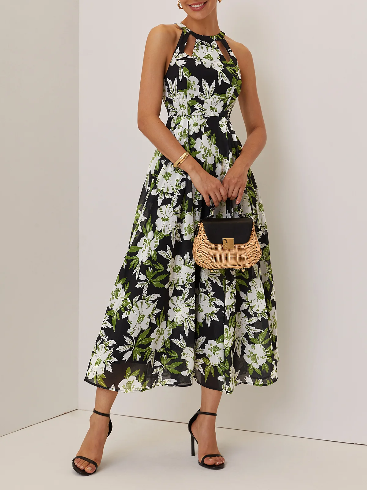Green Floral Hollow Out Chiffon Crew Neck Sleeveless A-Line Maxi Dress