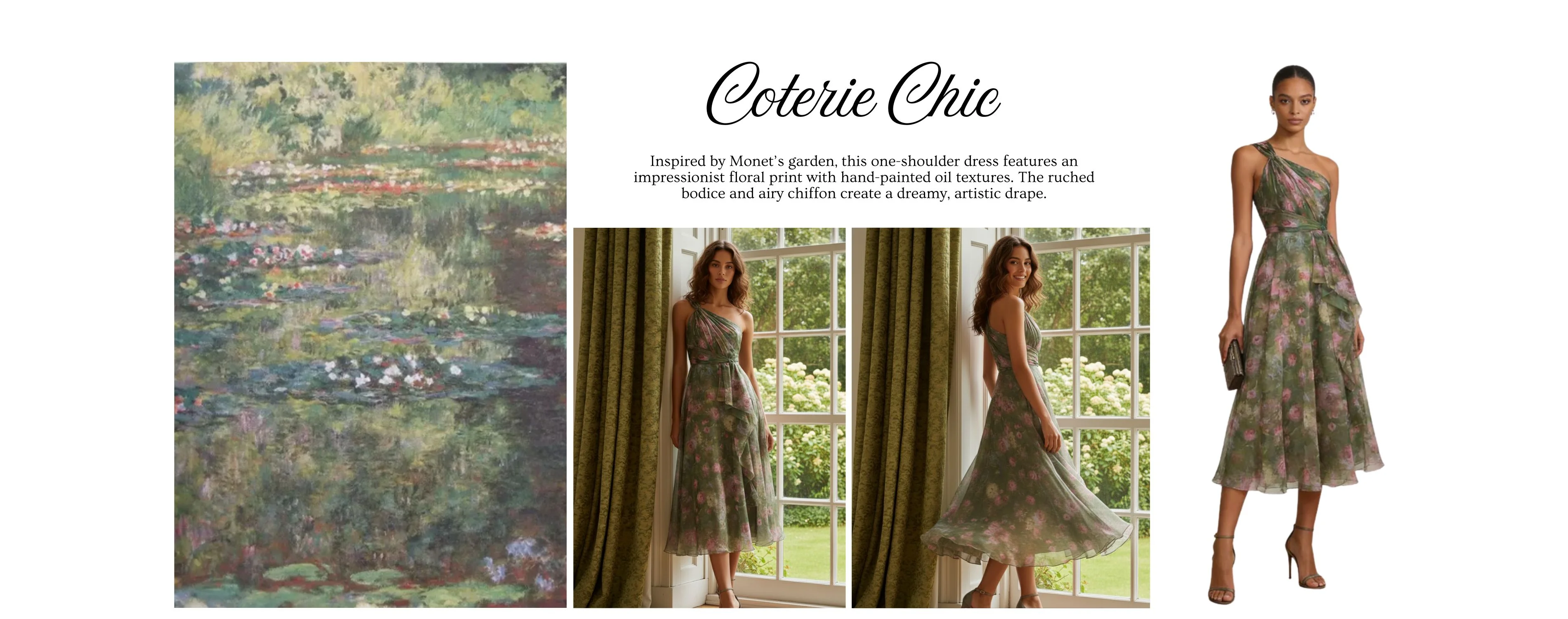 Inspired by Monet’s garden, this one-shoulder dress features an impressionist floral print with hand-painted oil textures. The ruched bodice and airy chiffon create a dreamy, artistic drape. Perfect for summer afternoon soirées.