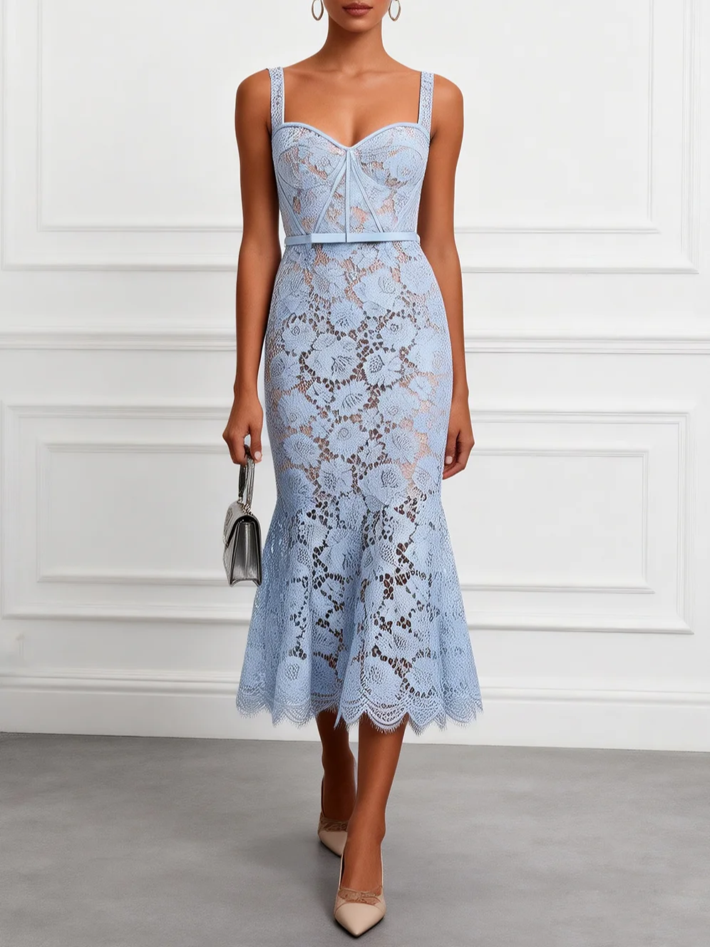 Glow at bridal showers, upscale garden parties, or formal spring receptions. This sweetheart neckline mermaid dress features a sculpted bodice with a dramatic flared midi skirt. Crafted in luminous light blue lace, the design offers a statuesque movement.