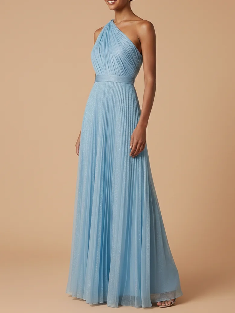 Look stunning in this light blue A-line pleated tulle maxi bridesmaid dress from Fehaute. Designed with a one-shoulder neckline and pleated style, it offers elegance, comfort, and a flattering fit for weddings and formal events.