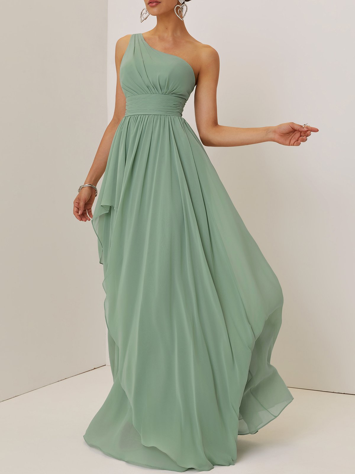 Light Green Ruched Asymmetric Chiffon One Shoulder Sleeveless A-Line Maxi Bridesmaid Dress