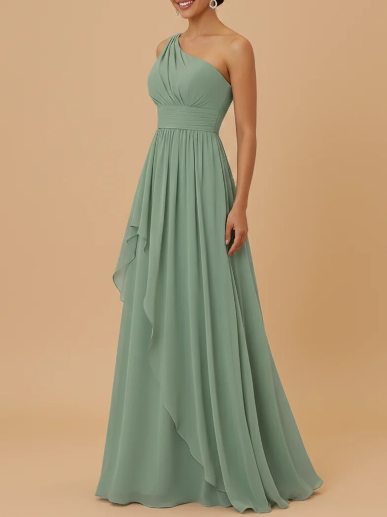 Elegant and effortless, this sage green one-shoulder chiffon bridesmaid dress features a flattering A-line maxi silhouette with soft ruching. Lightweight, flowy, and perfect for modern weddings and formal bridal parties.