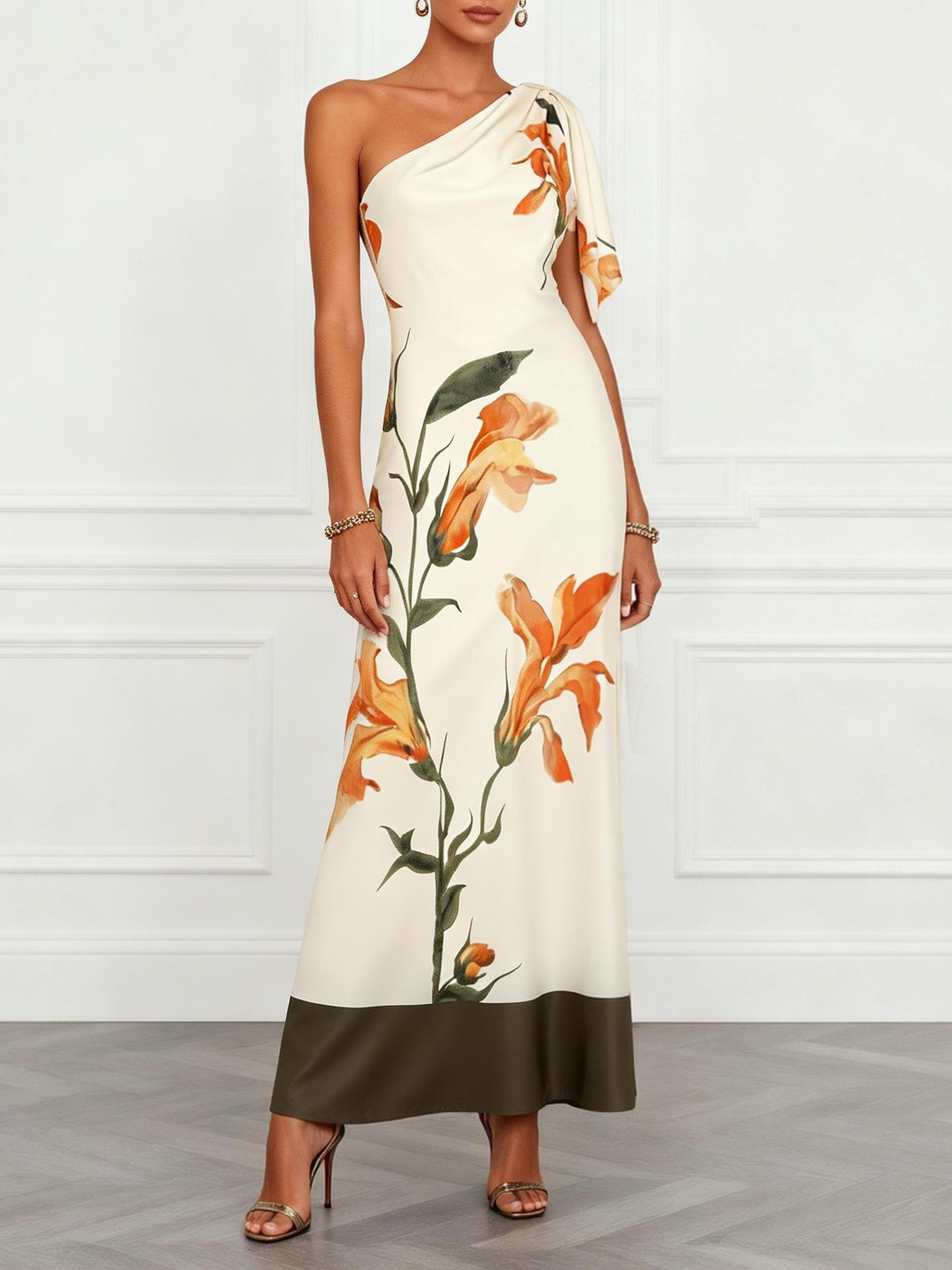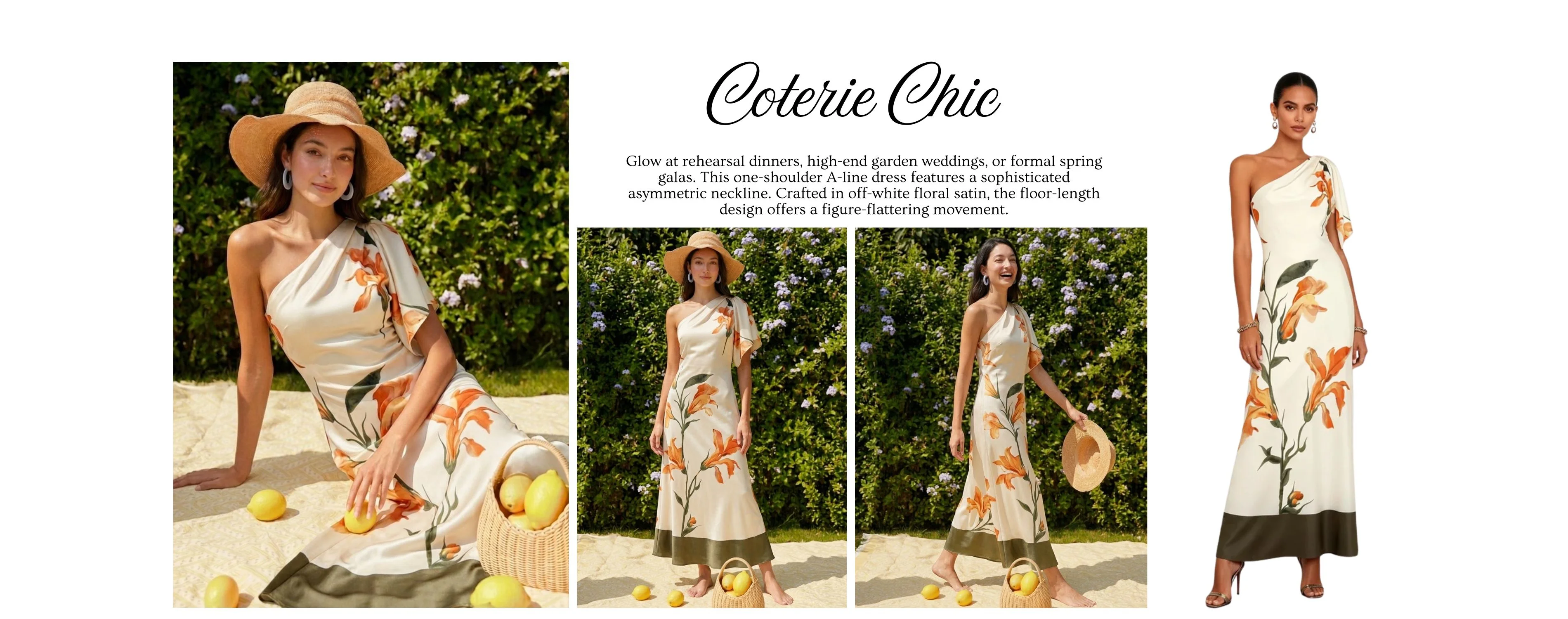 Glow at rehearsal dinners, high-end garden weddings, or formal spring galas. This one-shoulder A-line dress features a sophisticated asymmetric neckline. Crafted in off-white floral satin, the floor-length design offers a figure-flattering movement.