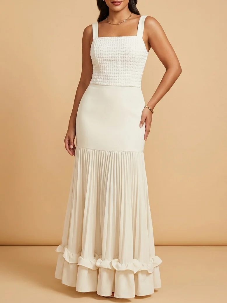 This off-white maxi dress features a unique textured bodice and a playful pleated ruffle hem. An effortless choice for rehearsal dinners, civil ceremonies, or as a chic second look for your wedding reception. Feel elegant, stay comfortable.