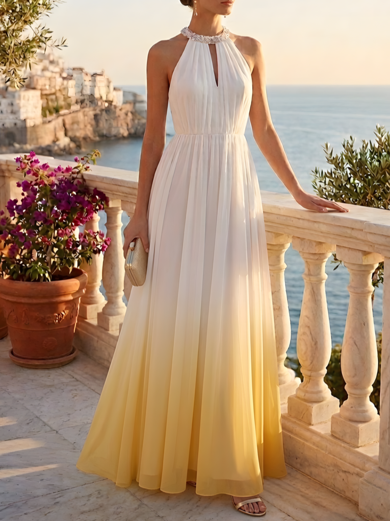 Stun in this Ombre Halter Maxi Dress. Featuring a sunset yellow gradient, elegant pleated high-waist, and flowy silhouette, it’s the perfect wedding guest gown for summer beach parties. Light, airy, and effortlessly chic.