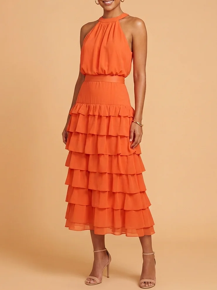 This burnt orange bridesmaid dress features a halter neckline and a flowing tiered ruffle maxi skirt. The layered design adds movement and design, making it perfect for fall weddings, outdoor ceremonies, and elegant bridal parties.