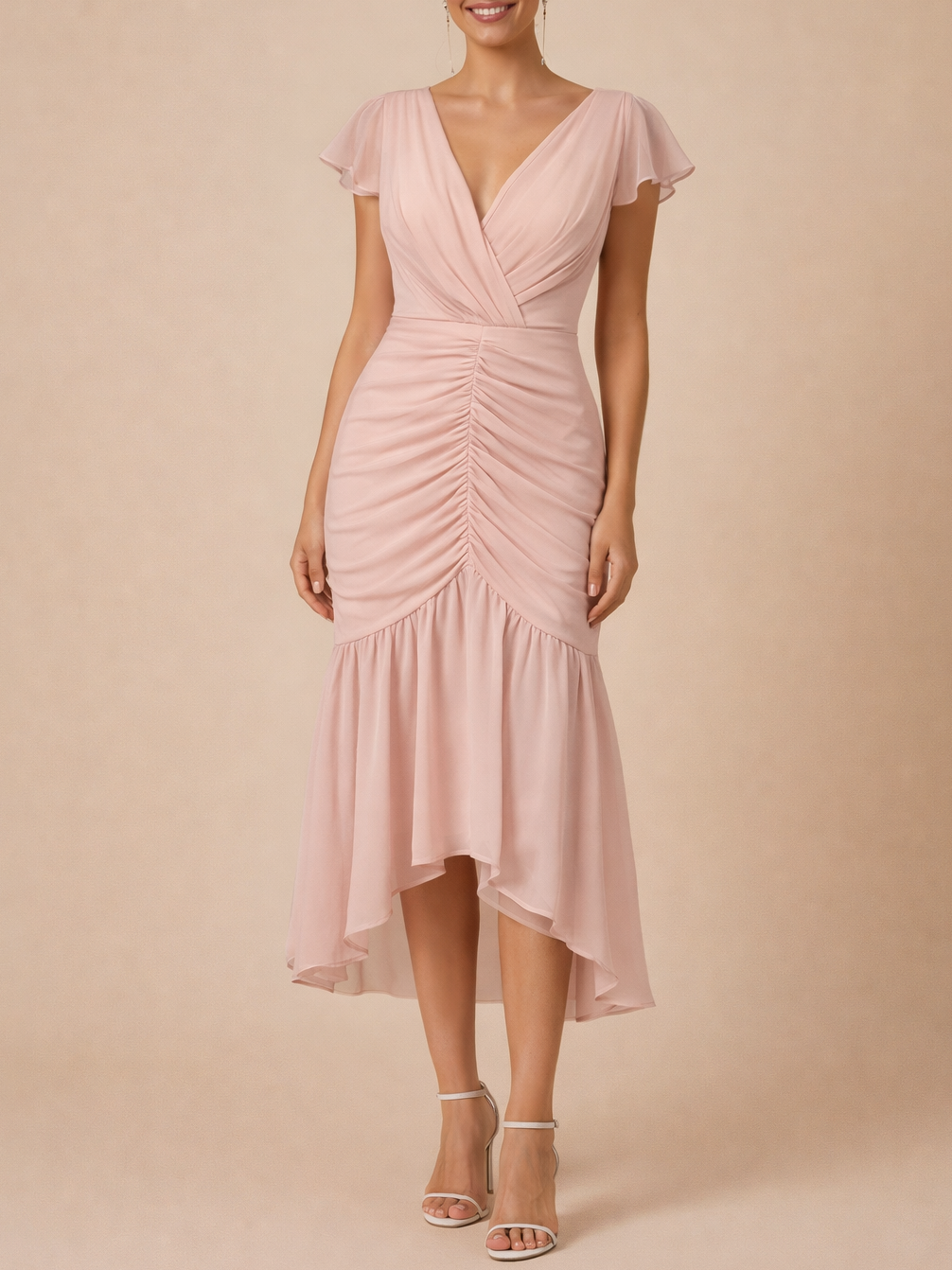 Blush Pink Mermaid Midi Ruched V-Neck Flutter Sleeve Bridesmaid Dress