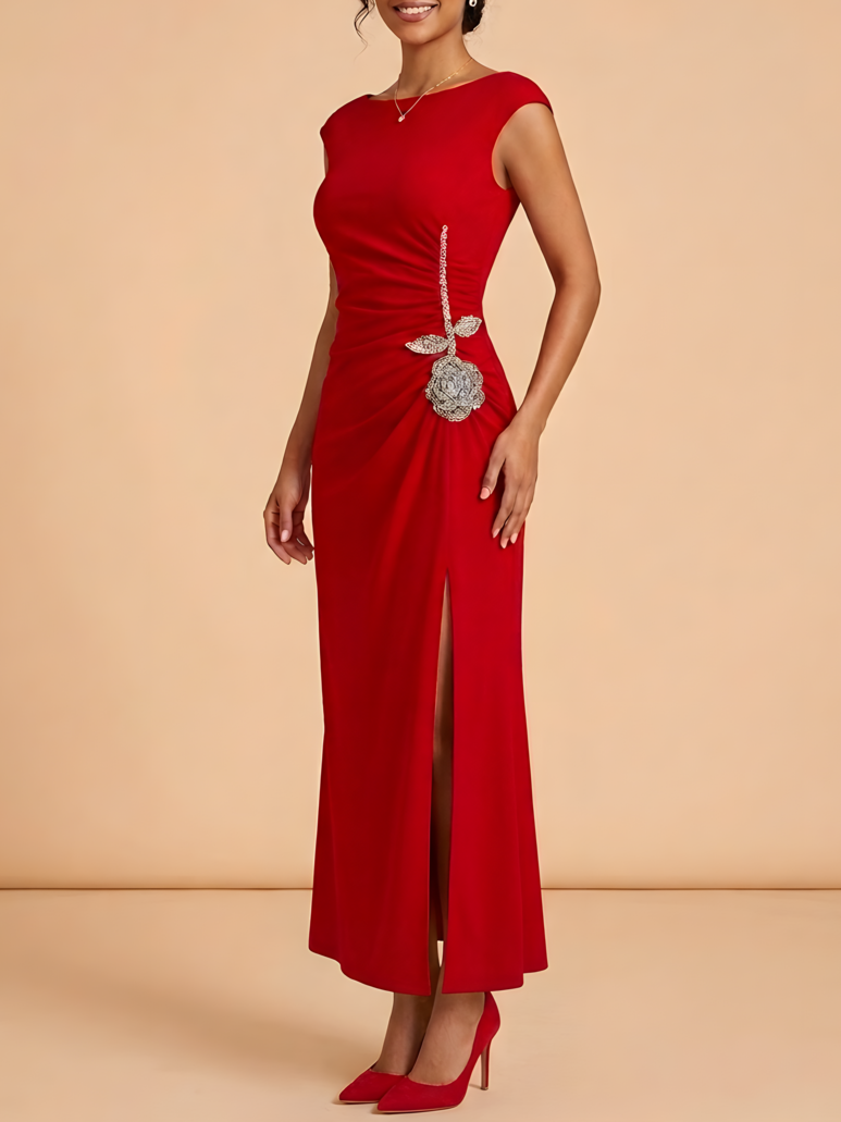 Sophisticated and bold, this vibrant red maxi dress features a modest boat neck and cap sleeves. The flattering ruched waist is accented by a shimmering crystal rose applique, leading into a daring side slit for a modern, elegant finish.