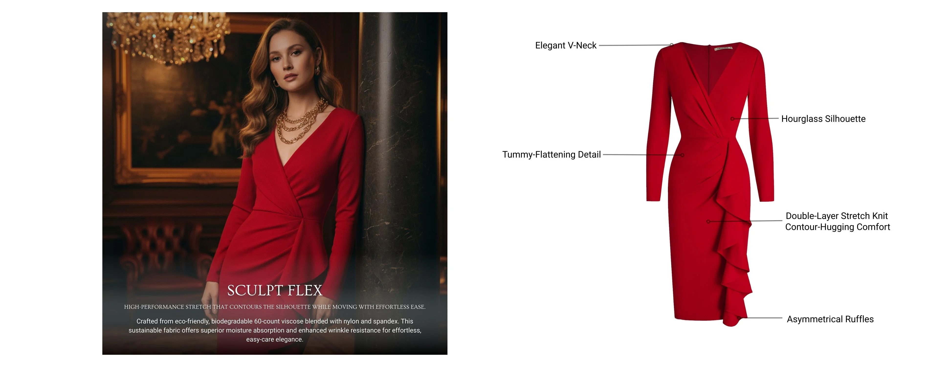 Make a striking impression at holiday parties, date nights, or evening events. This stretch knit midi features a flattering V-neck and elegant long sleeves. Feminine ruffled and ruched details sculpt the body for a figure-hugging sheath fit.