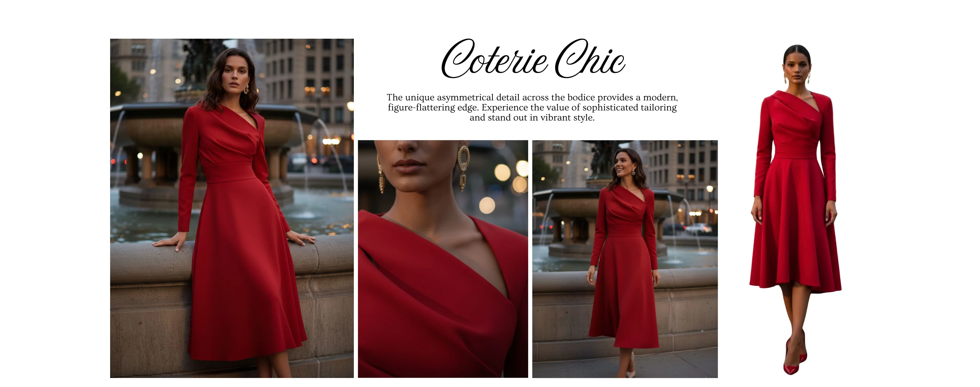 This classic midi features an elegant A-line silhouette and long sleeves. The unique asymmetrical detail across the bodice provides a modern, figure-flattering edge. Experience the value of sophisticated tailoring and stand out in vibrant style.