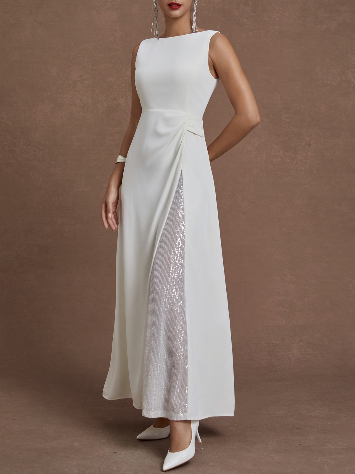 White Sequin Classic Crew Neck Sleeveless A-Line Maxi Dress