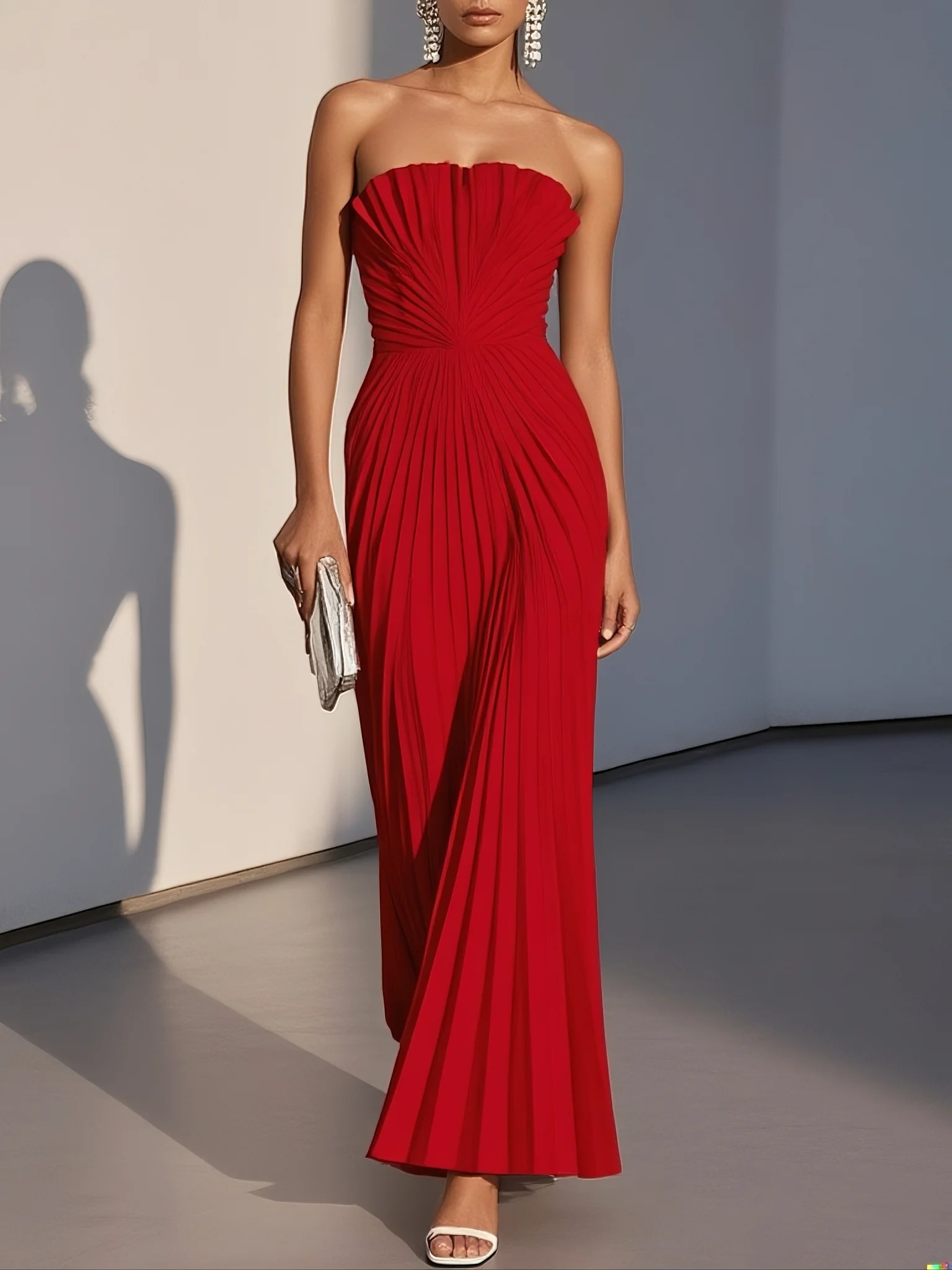 This stunning gown features a flattering strapless design and graceful pleats, perfect for formal events or summer soirées. Make a statement and embrace your inner goddess with this timeless piece!