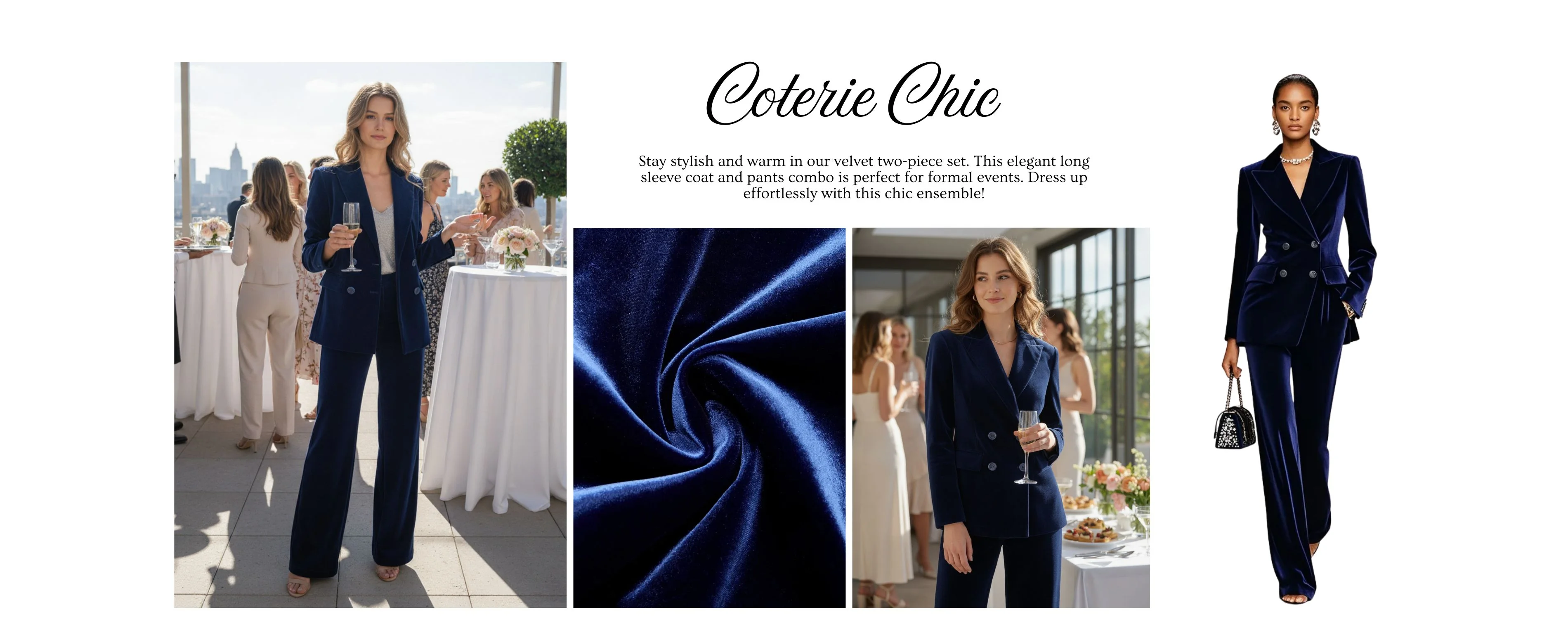 Stay stylish and warm in our Navy Velvet Blue Piping Lapel Collar Two-Piece Set. This elegant long sleeve coat and pants combo is perfect for formal events. Dress up effortlessly with this chic ensemble!