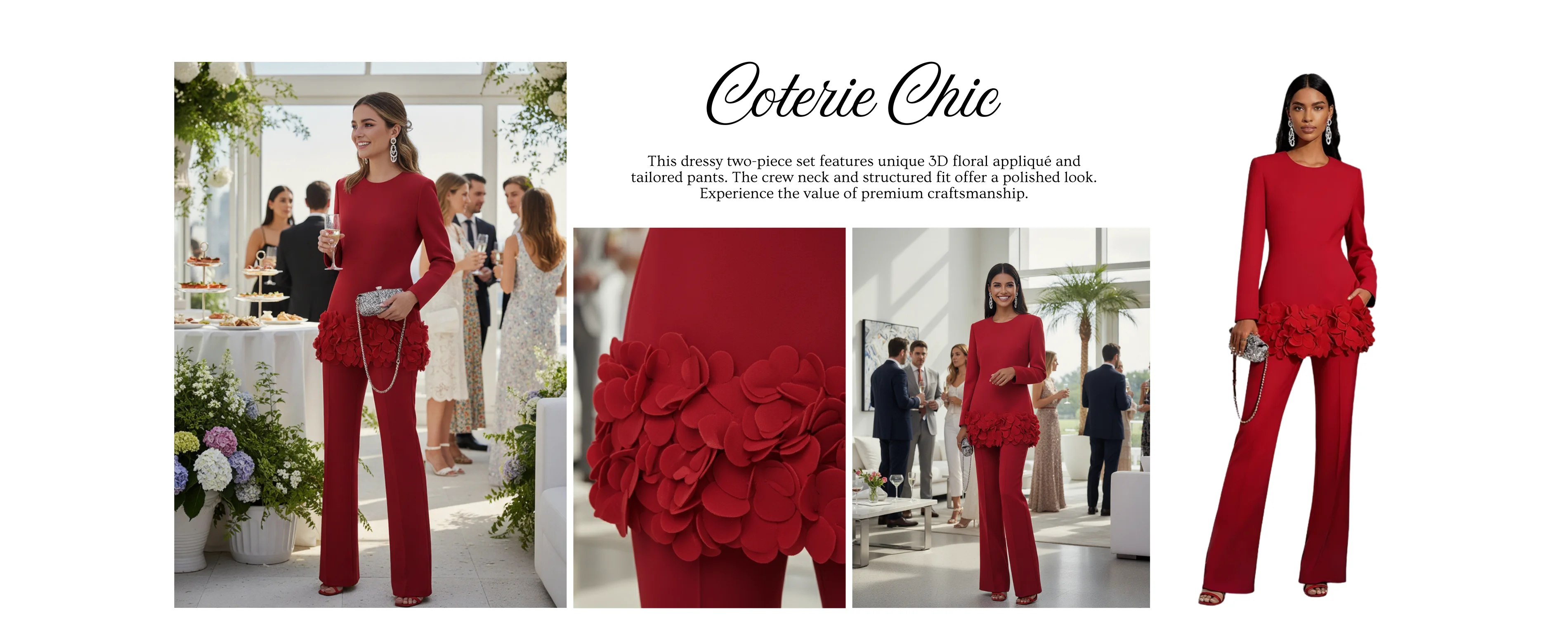 This dressy two-piece set features a long sleeve top with unique 3D floral appliqué and tailored pants. The crew neck and structured fit offer a polished look. Experience the value of premium craftsmanship and stand out in vibrant, sophisticated style.