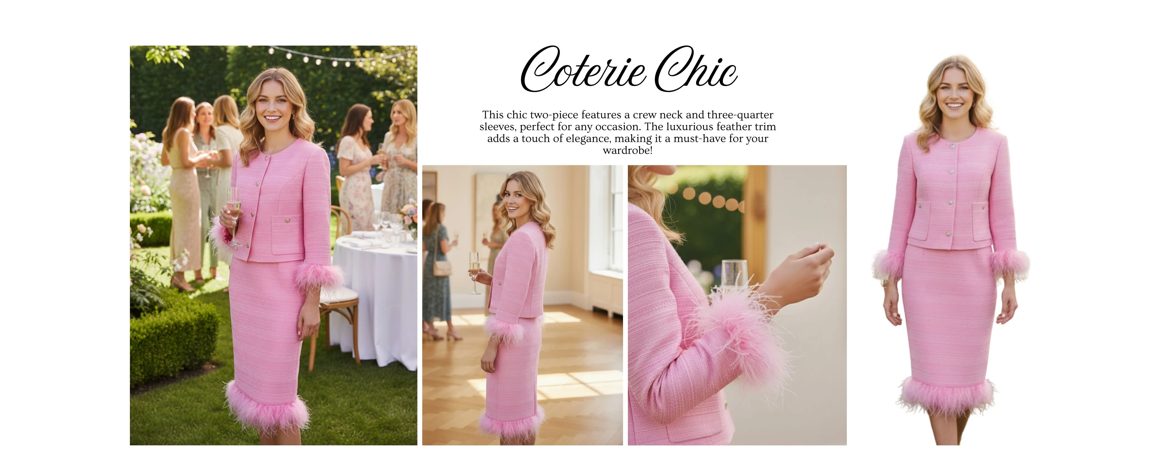This chic two-piece features a crew neck and three-quarter sleeves, perfect for any occasion. The luxurious feather trim adds a touch of elegance, making it a must-have for your wardrobe!