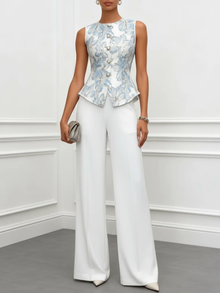Shine at bridal showers, summer garden parties, or formal soirées. This dressy top with pants set features a sculpted jacquard bodice with a statement buckle and tailored trousers. Crafted in luminous white jacquard, the design offers a polished movement.